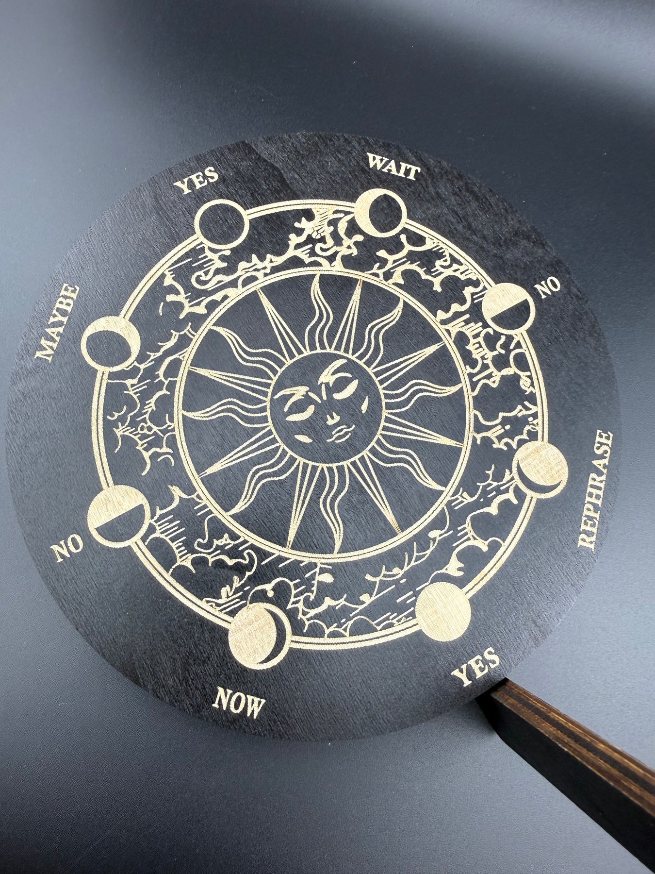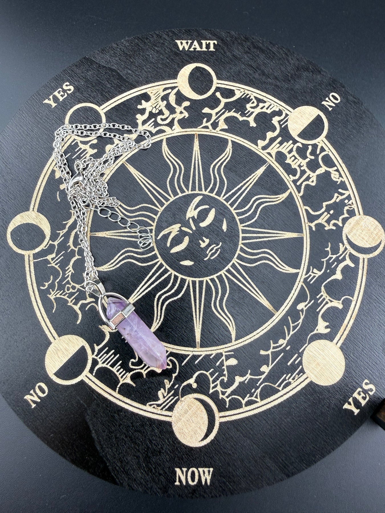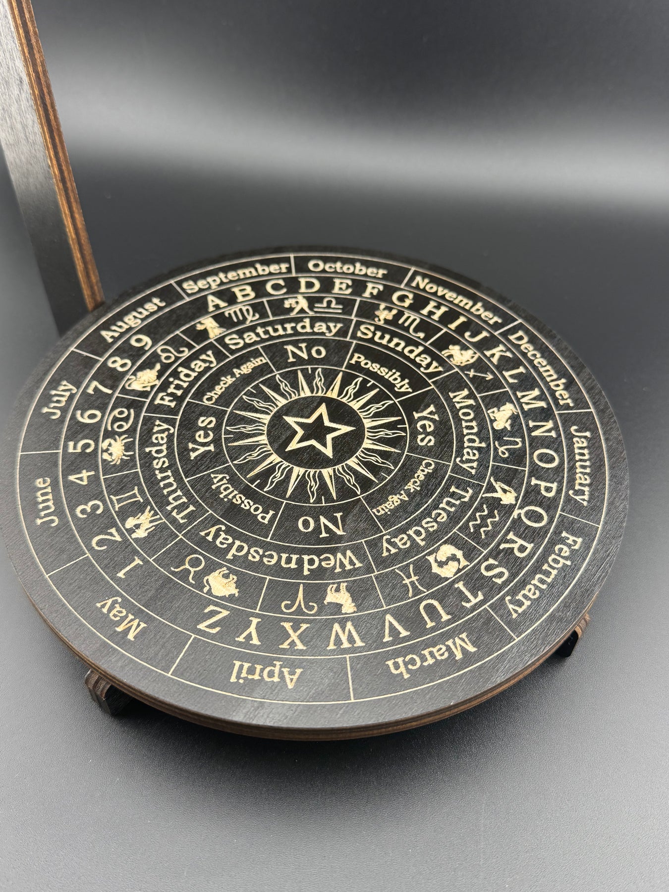 Designed to hold your pendulum steady and centered, this stand creates a sacred space for pendulum readings, dowsing, decision-making, and spiritual guidance. The circular divination board features classic responses — Yes, No, Maybe, Wait, Now, and Rephrase — arranged around a radiant sun and star motif, symbolizing divine timing and cosmic wisdom.