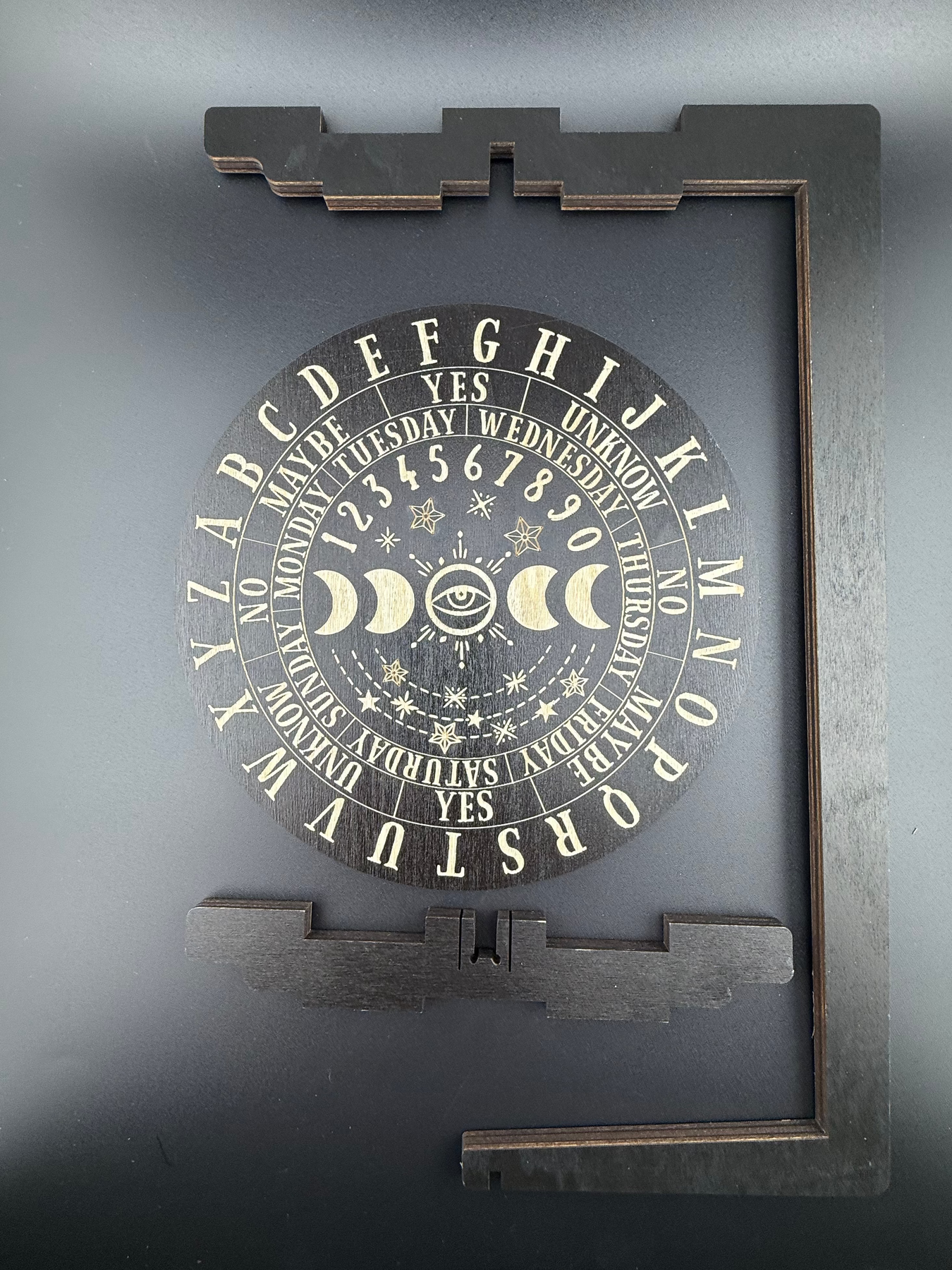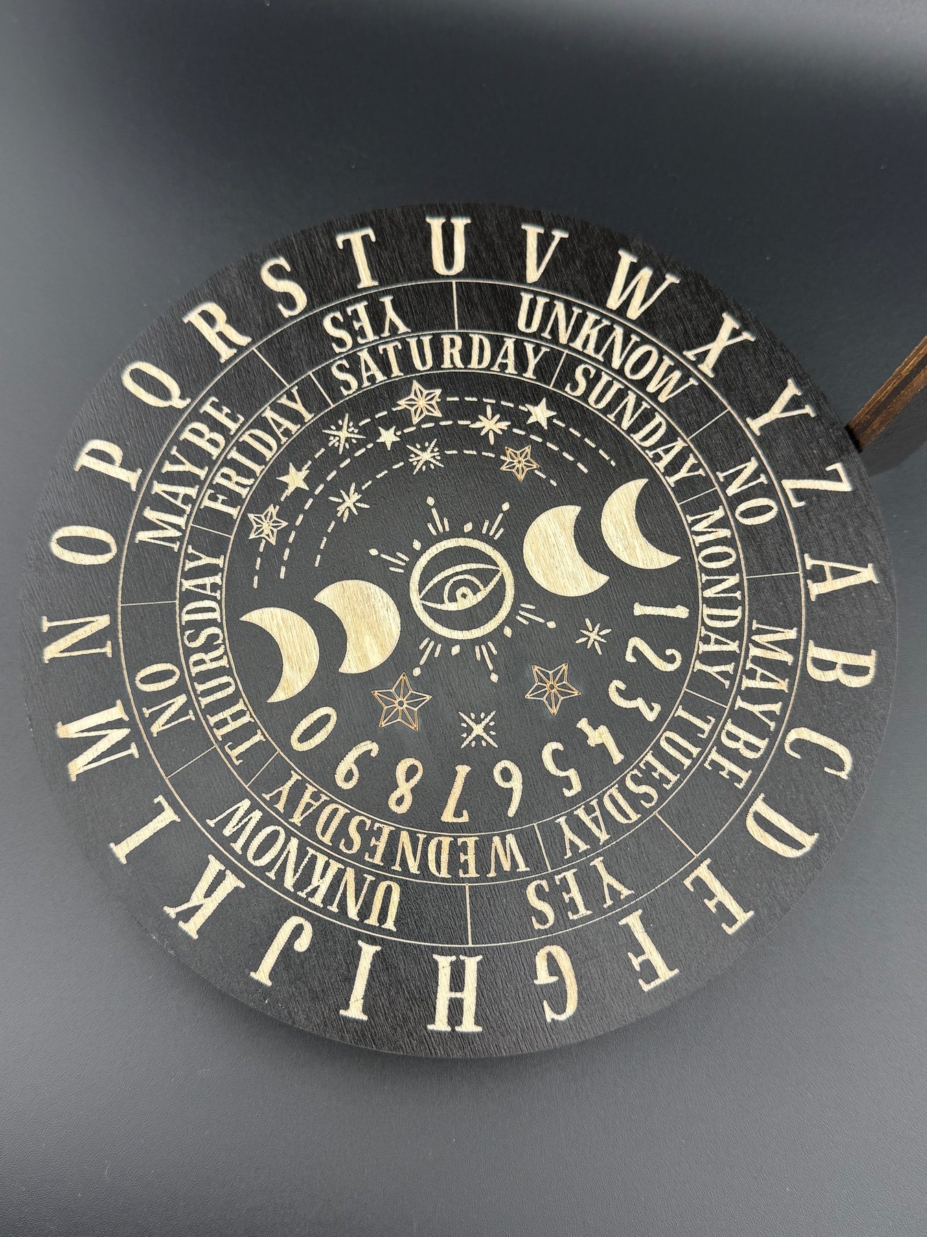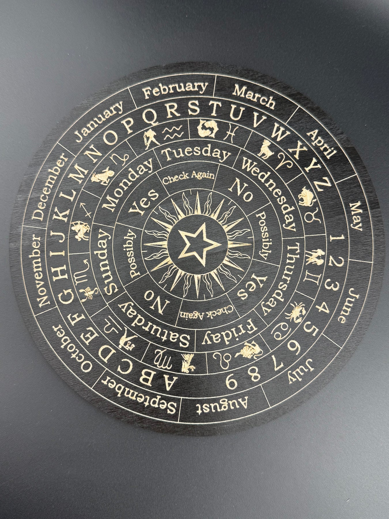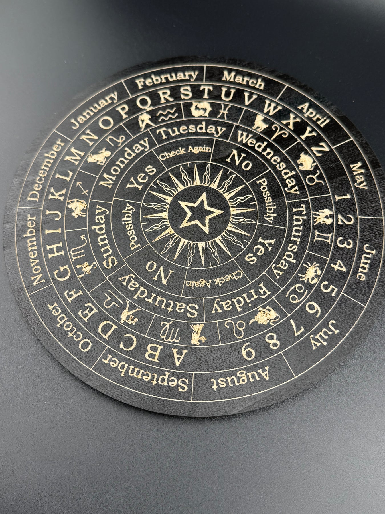 Designed to hold your pendulum steady and centered, this stand creates a sacred space for pendulum readings, dowsing, decision-making, and spiritual guidance. The circular divination board features classic responses — Yes, No, Maybe, Wait, Now, and Rephrase — arranged around a radiant sun and star motif, symbolizing divine timing and cosmic wisdom.